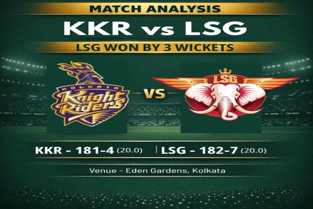 Lucknow Super Giants pulled off a stunning heist at Eden Gardens, defeating Kolkata Knight Riders by three wickets in one of the most dramatic finishes of the season. Ajinkya Rahane’s 41 and Angkrish Raghuvanshi’s 45 set a solid foundation, while Rovman Powell’s unbeaten 39 powered KKR to a competitive 181. The night, however, belonged entirely to Mukul Choudhary, whose explosive 54 off 27 balls including seven towering sixes turned the game on its head, and with 14 needed off the final over, Choudhary and Avesh Khan scrambled home to secure LSG’s second win. Kolkata Knight Riders are yet to win a game in IPL 2026 after the first three games, with a single point on the board due to a washed out match against PBKS.